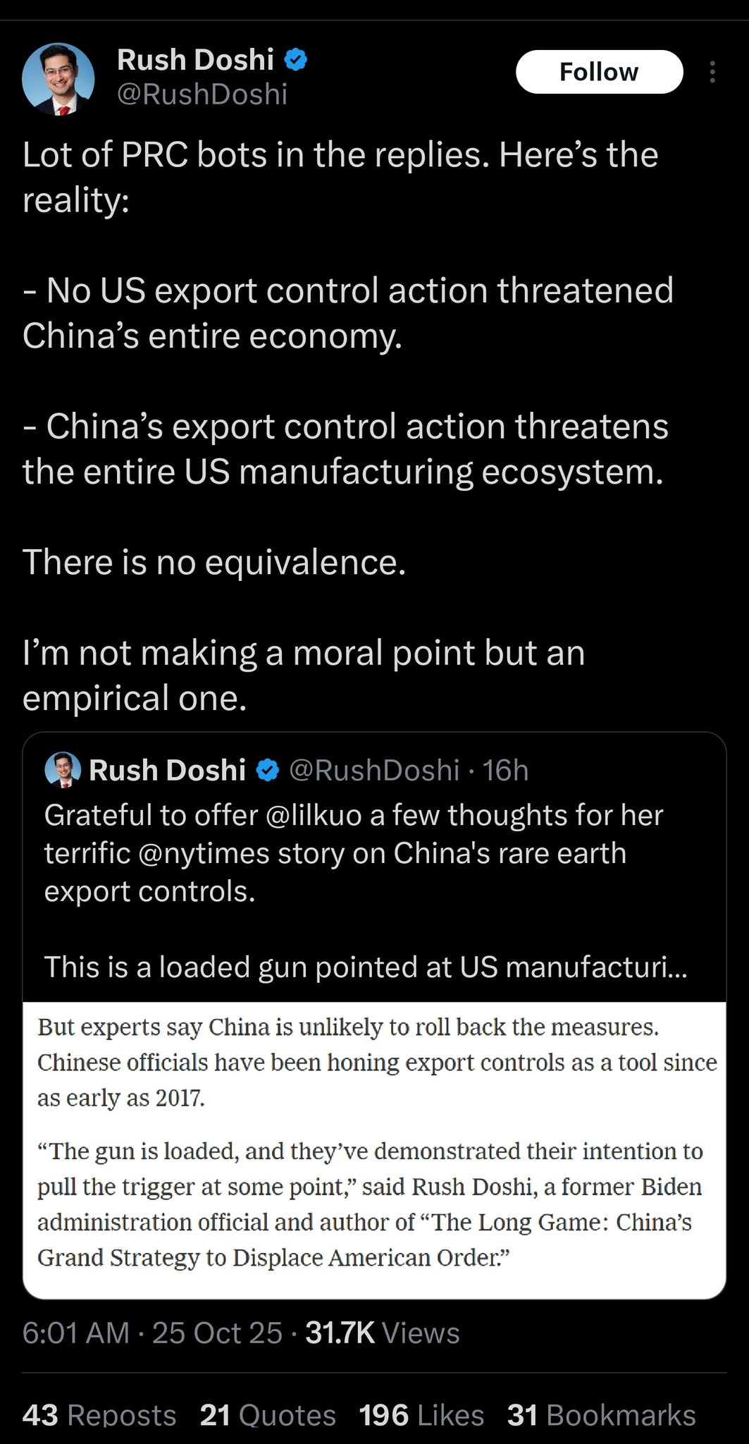 Dans ce post, Doshi traite les personnes qui ont critiqué les contrôles à l’exportation américains qu’il a conçus de « robots de la RPC« . C’est caractéristique de l’arrogance et du mépris que l’administration Biden avait pour le point de vue de la Chine (et accessoirement de la Russie aussi) et a créé un tort immense aux États-Unis. Lorsque vous avez si peu de respect pour votre adversaire que vous rejetez d’emblée ses préoccupations et ses commentaires comme étant ceux de « robots » insensés, vous ne devriez pas être surpris lorsque vos politiques se retournent contre vous de manière catastrophique. Le contrôle des exportations de semi-conducteurs en est un parfait exemple : bien sûr, la Chine allait avoir d’immenses inquiétudes à ce sujet, bien sûr, ils allaient considérer cela comme une tentative d’étrangler leur développement, et bien sûr, ils allaient tout faire pour contrecarrer cela (ce qu’ils ont fait avec succès, aux dépens des États-Unis : Nvidia est passé de 95% de part de marché en Chine à 0%). Mais parce que les décideurs américains comme Doshi vivent dans une chambre d’écho où toute préoccupation chinoise est sans valeur puisque ce sont juste des “robots” stupides qui bougent tous seuls, ils ont ignoré tout cela.