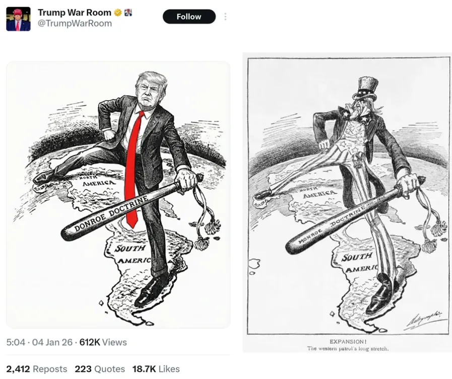 L’image adapte une caricature politique de 1905 de Louis Dalrymple, qui se voulait un commentaire critique de l’agression américaine en Amérique latine à l’époque du “gros bâton” de Teddy Roosevelt. La version Trump remplace Oncle Sam par Trump, rebaptise le club « Doctrine Donroe » et le publie comme célébration. En d’autres termes, la critique et la caricature sont devenues l’image de soi. Ils prennent ce qui avait été conçu comme une dénonciation de l’impérialisme et de l’agression, et disent : “Oui, c’est nous, et nous l’embrassons pleinement.”